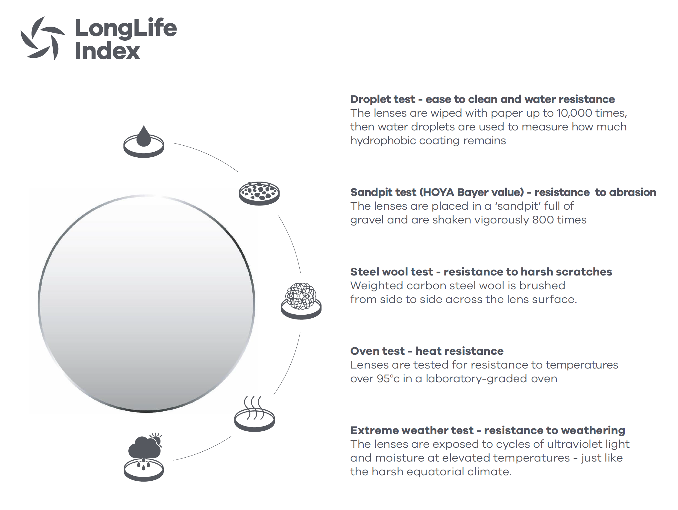 The LongLife Index was developed and adopted by HOYA as a working standard. Passing the rigorous and severe tests gives us the confidence that the coating is of the highest quality and is able to endure extreme conditions and various lifestyles.